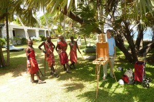 Finally a picture of me painting. These Masai were invited to pose and they dansed for us at sunset. Traditional clothes with on extra item: mobile phone at the hip.