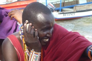 Eindelijk een foto van mij achter de ezel. Deze Masai kwamen speciaal om te poseren en te dansen bij zonsondergang. Eén item is toegevoegd aan de traditionele kleding. Een mobieltje hangt op de heup.