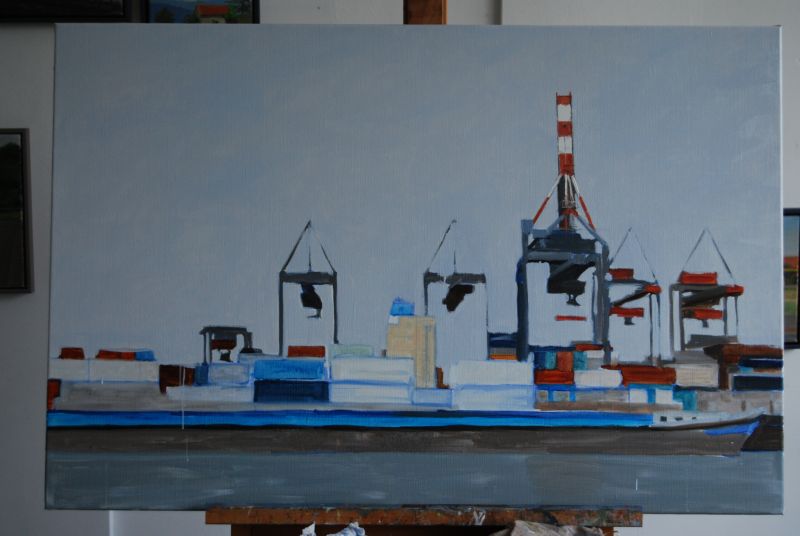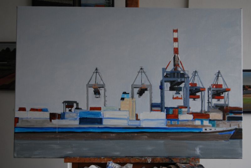 De haven van Rotterdam. Ik vind de kleuren en vormen prachtig. Het is zo afgewogen dat het lijkt alsof iemand het gecomponeerd heeft. Ik hoef geen kleur aan te passen. Alles is op elkaar afgestemd. Op m’n palet alleen titaanwit, ultramarijn, gebrande sienna, ceruleum en een klein beetje oranje.