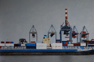 Het havenschilderij is klaar. Het schip op de voorgrond was nog véél langer.