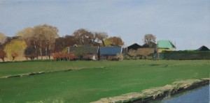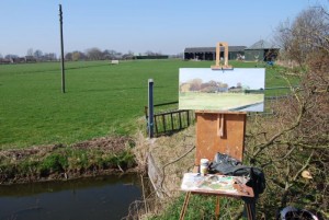 On the narrow road along the river Gein it is difficult to find a spot. Standing on the road is impossible because there are huge tractors stopping by occasionally. So, easel in the verge of the road and myself on the road, so you can walk a few meters backwards to see if the result is good and I can jump aside when a car is coming near.
