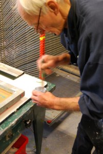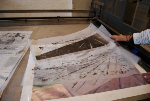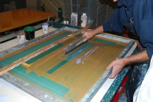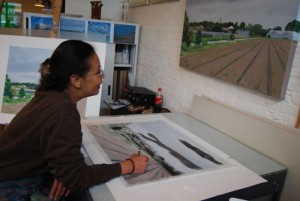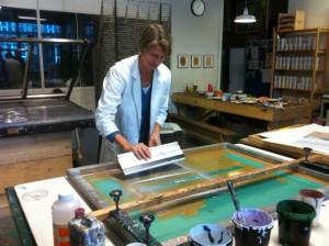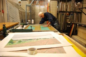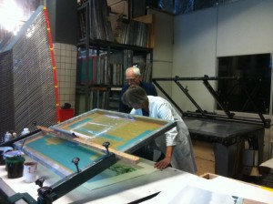 Business Art Service laat een zeefdruk maken van een van mijn landschappen. Gisteren mocht ik kijken. Mike an Gita Leach zijn al bezig met de derstigste (!) drukgang. Het is monnikenwerk, maar dan heb je wel 40 exemplaren.