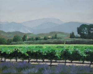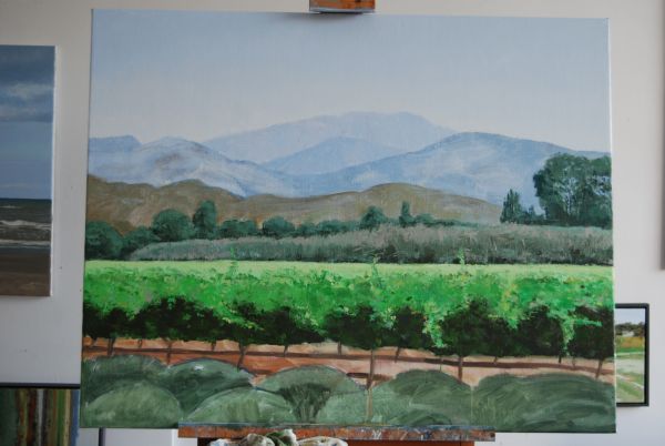 In mijn eerste boekje staat een schilderij van een wijnveld in de Provence van 40 x 50 cm. Een klant vond dat prachtig, maar helaas was het verkocht en bovendien wilden ze een veel groter schilderij voor boven de bank. Ik bood aan om het nog een keer te schilderen, maar dan groter (95 x 120 cm). Het eerste schilderij heb ik in Frankrijk, ter plaatse geschilderd, nu gebruikte ik m’n eigen schilderij als voorbeeld.