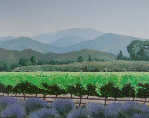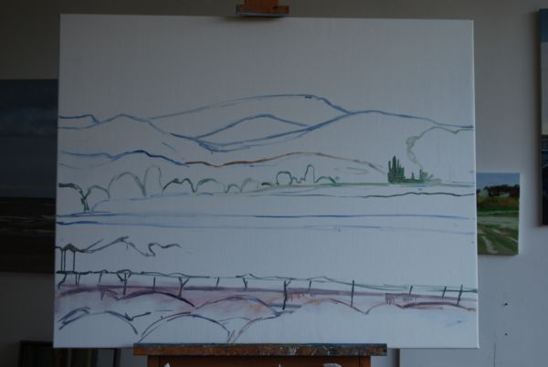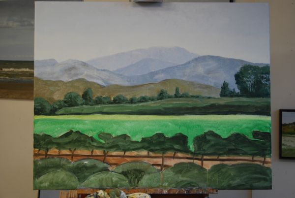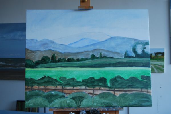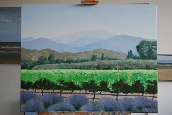 Nadat ik de lavendel had geschilderd bleken de bergen toch te druk te zijn en heb ik ze rustiger gemaakt. Ook de voorste heuvels waren te warm. Die heb ik koeler van kleur gemaakt, zodat er meer ruimte in het schilderij ontstond.