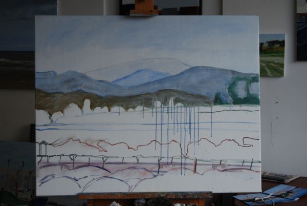 Ik begin met de lucht. Ik meng de kleur heel zorgvuldig en breng de verf aan met mijn paletmes. De bergen wil ik zo laten, opgezet in dunne verf.